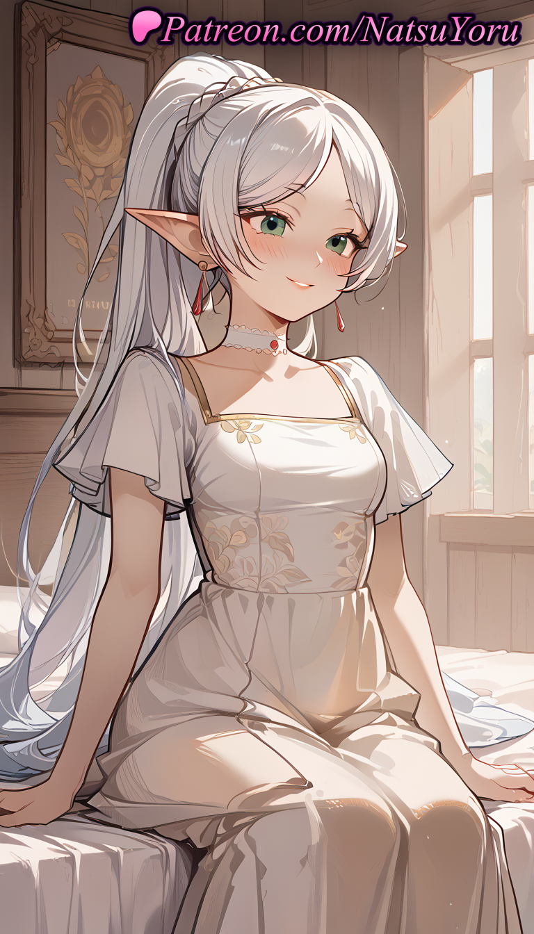 1girl 1girl 1girls 2025 ai ai_assisted ai_generated anime anime_style artist_name bangs big_breasts blush braid breasts bust choker closed_mouth collarbone dress drop_earrings earrings elf elf_ears female_focus female_only female_solo floral_print frieren green_eyes hentai high_ponytail high_quality high_res high_res high_resolution indoors jewelry long_hair looking_at_viewer natsuyoru on_bed parted_bangs parted_lips patreon picture_frame pointed_ears pointy_ears ponytail short_sleeves sitting small_breasts smile solo_female sousou_no_frieren stable_diffusion sunlight very_long_hair voluptuous voluptuous_female white_choker white_dress white_hair window