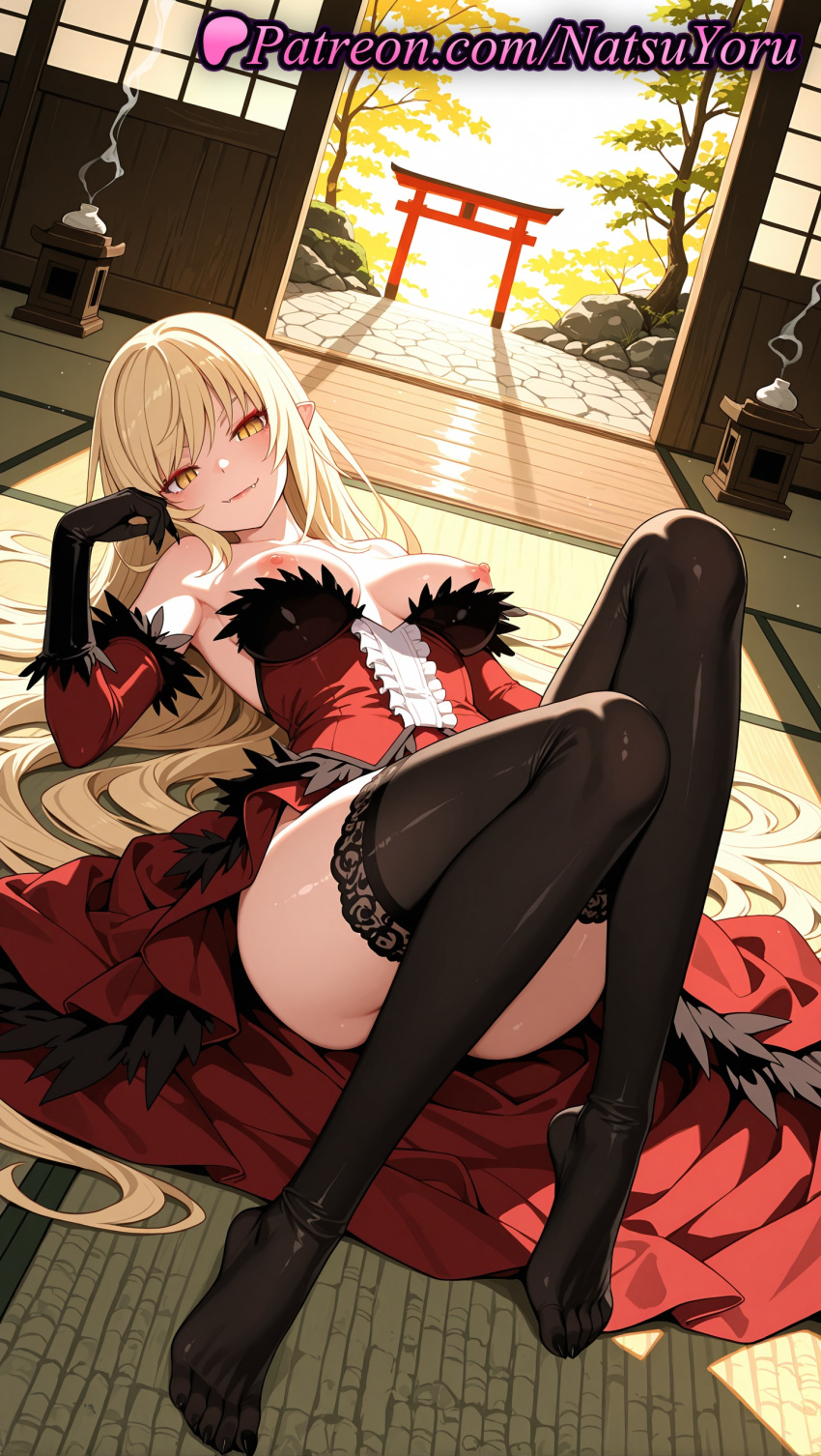 1girl 1girls 2025 ai ai_assisted ai_generated anime anime_style architecture bakemonogatari bangs bare_shoulders big_breasts big_breasts black_gloves black_legwear black_thighhighs blonde_hair blush breasts breasts_out bust cleavage closed_mouth convenient_leg detached_sleeves dress dutch_angle east_asian_architecture elbow_gloves feather_trim feet female_focus female_only foot_fetish frills full_body fur_trim gloves hair_spread_out hentai high_quality high_res high_res high_resolution indoors juicy_butt kiss-shot_acerola-orion_heart-under-blade knees_up legs long_hair looking_at_viewer lying makeup monogatari_(series) natsuyoru nipple_slip nipples nipples_outside no_shoes non-asian on_back on_floor one_breast_out parted_lips patreon pointed_ears pointy_ears red_dress shiny shouji sitting sliding_doors slit_pupils smile solo_female stable_diffusion stockings stockings stone_lantern strapless strapless_dress tatami thighs toes torii uncensored_nipples vampire very_long_hair voluptuous voluptuous_female yellow_eyes